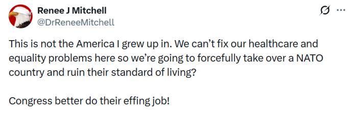 “这不是我长大的美国。我们连自己的医疗和公平问题都解决不了,却要强行占领一个北约国家(的自治领地),毁掉他们的生活?国会最好好好履职!” ↓