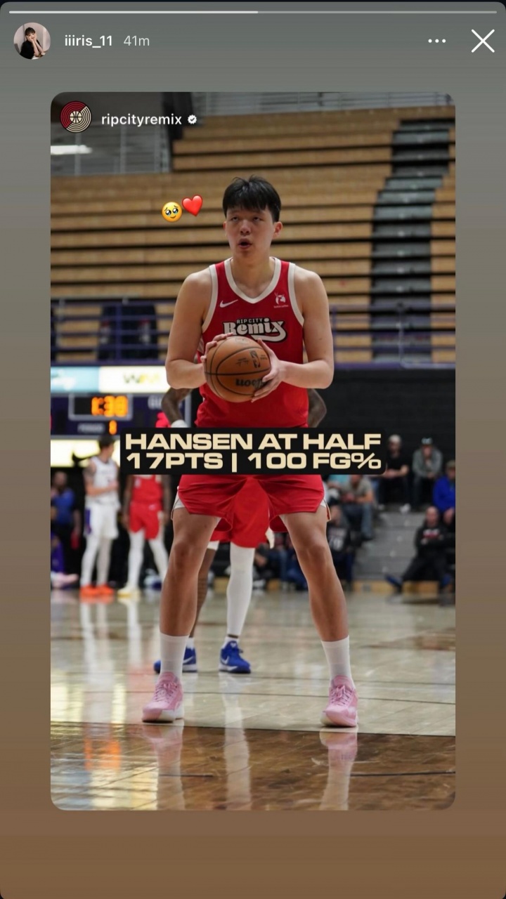 杨瀚森的女友在社媒转发了杨瀚森上半场的表现并配上了:“🥺❤️”的表情。